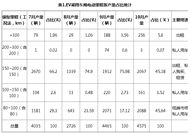 在新能源乘用車(chē)方面,純電動(dòng)和插電式與上月產(chǎn)量總體變化不大,但純電動(dòng)乘用車(chē)產(chǎn)量格局發(fā)生較大變化,插電式乘用車(chē)比亞迪秦仍是主力。截至 2014年10月底,已有超過(guò)30個(gè)地方城市(區(qū)域)發(fā)布了新能源汽車(chē)推廣應(yīng)用的支持政策,隨著新能源汽車(chē)地方支持政策的陸續(xù)落地,新能源汽車(chē)私人購(gòu)買(mǎi)市場(chǎng)有望迎來(lái)更快的增長(zhǎng)。純電動(dòng)乘用車(chē)本月產(chǎn)量前五位車(chē)型分別為:北汽E150、眾泰E20、江淮IEV4、啟辰晨風(fēng)E30,以及比亞迪E6。2014年以來(lái)一直穩(wěn)居純電動(dòng)乘用車(chē)排名第一位的康迪電跑本月僅排在第六位,以其累計(jì)約1.2萬(wàn)輛的產(chǎn)量來(lái)看,作為城市“微公交”的容量已經(jīng)接近飽和,接下來(lái)就要看其在“團(tuán)租”市場(chǎng)的表現(xiàn)了。北汽E150本月加大投產(chǎn)以滿(mǎn)足北京地區(qū)不斷增加的定單需求。另外值得注意的是,今年9月才上市的晨風(fēng)E30本月以458輛的產(chǎn)量擠進(jìn)前五位,為合資企業(yè)自主品牌在純電動(dòng)車(chē)市場(chǎng)上爭(zhēng)得了一席之地,反觀(guān)口碑不錯(cuò)但一直不溫不火的之諾1E,似乎再一次印證了國(guó)人對(duì)租賃這件事的接受度偏低的事實(shí),chinaev建議之諾1E不妨嘗試以租代購(gòu)這種形式,在國(guó)外很多高端車(chē)多采取這種方式。另外,以晨風(fēng)E3去除雙重補(bǔ)貼后仍超過(guò)18萬(wàn)的價(jià)格如果接下來(lái)還能保持這個(gè)勢(shì)頭并快速增長(zhǎng),是否可以說(shuō)明純電動(dòng)乘用車(chē)的價(jià)格并不是最重要的問(wèn)題,更針對(duì)市場(chǎng)需求的產(chǎn)品和更好的用戶(hù)體驗(yàn)才更為重要。在純電動(dòng)乘用車(chē)?yán)锍谭植挤矫婵矗?-10月產(chǎn)量最集中的是80至100公里和150至200公里的兩個(gè)里程段,10月這兩個(gè)里程段產(chǎn)量總和更占到90%以上。不知這個(gè)統(tǒng)計(jì)是否與國(guó)家的補(bǔ)貼標(biāo)準(zhǔn)相對(duì)應(yīng),我們不妨印證一下,80至150公里是一個(gè)補(bǔ)貼檔位(3.5萬(wàn)元),150至250公里是一個(gè)補(bǔ)貼檔位(5萬(wàn)元),在同一檔位中取低段,即80至100公里和150至200公里當(dāng)屬車(chē)企的最高“投入產(chǎn)出比”區(qū)域了,但chinaev也想在此提醒,國(guó)家的補(bǔ)貼標(biāo)準(zhǔn)是動(dòng)態(tài)調(diào)整的,尤其是免購(gòu)置稅目錄的動(dòng)態(tài)調(diào)整更將是常態(tài),對(duì)照補(bǔ)貼造車(chē)還是對(duì)照市場(chǎng)造車(chē),應(yīng)該好好權(quán)衡一下。本月里程電量比前五位車(chē)型沒(méi)有變化(見(jiàn)表2)。