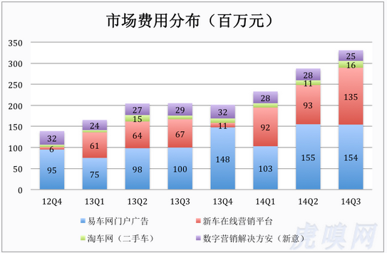 2003年成立的新意互動(dòng),是專門為汽車經(jīng)銷商提供互聯(lián)網(wǎng)營(yíng)銷服務(wù)的廣告公司,主要是幫助商家將車型、價(jià)格等信息推向各類網(wǎng)站。雖然營(yíng)收占比越來越少,但這項(xiàng)業(yè)務(wù)一頭連著客戶(經(jīng)銷商)、另一頭連著媒體(網(wǎng)站)。十多年的積累非比尋常,使易車在市場(chǎng)營(yíng)銷取得事半功倍的效果。由于相對(duì)成熟,易車對(duì)這項(xiàng)業(yè)務(wù)的市場(chǎng)營(yíng)銷費(fèi)用有限,在市場(chǎng)費(fèi)用中的占比更是一路滑落。2012年Q4,易車不到1.5億市場(chǎng)及行政費(fèi)用(易車獨(dú)特的歸類方法),新意互動(dòng)占用了3200萬。2014年Q3,市場(chǎng)及行政費(fèi)用超過3.3億,新意互動(dòng)只分配到2500萬。