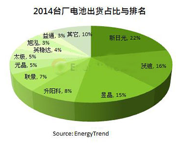 據(jù)統(tǒng)計(jì),新日光合并后產(chǎn)能擴(kuò)大效益顯現(xiàn),發(fā)貨量一舉超越茂迪,成為臺(tái)灣第一大廠,2014年出貨比重高達(dá)22%;茂迪及昱晶則分別以16%及15%緊追在后。臺(tái)灣前三大廠出貨比重即高達(dá)53%。觀察2015年臺(tái)灣電池產(chǎn)能變化狀況,茂迪合并聯(lián)景將于6月底完成,總產(chǎn)能將達(dá)到3GW,預(yù)期2015年全年茂迪將有機(jī)會(huì)再奪回臺(tái)灣第一寶座。
