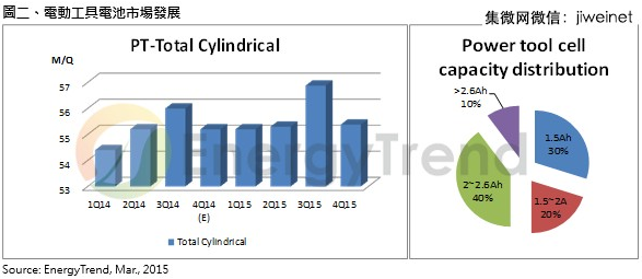 EnergyTrend指出,在IT需求逐漸走向輕薄化而減少電池芯顆數(shù)的趨勢下,動力工具更是電池芯廠積極加入的藍(lán)海市場;由于電動工具功率輸出較高,產(chǎn)品壽命要求也較為嚴(yán)苛,市場需求穩(wěn)定發(fā)展,然同樣面臨電池容量提升而使用顆數(shù)降低的現(xiàn)象,因此今年度鋰電池在電動工具市場需求仍維持持平局面,約占2.2億顆。