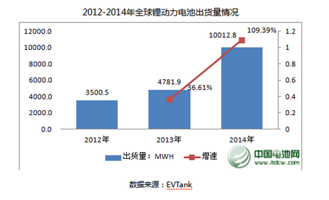 2014年,全球新能源汽車在美國、中國、日本和歐盟等國家產(chǎn)銷量的帶動下超過了30萬輛,僅中國新能源汽車產(chǎn)量在2014年達(dá)到了7.85萬輛,同比增長近4倍。在此背景下,給整車企業(yè)配套的動力電池生產(chǎn)企業(yè)出貨量大幅度增長,大量動力電池生產(chǎn)企業(yè)出現(xiàn)了產(chǎn)能吃緊的情況。EVTank統(tǒng)計數(shù)據(jù)顯示,2014年全球鋰動力電池出貨量達(dá)到10012.8MWH,同比2013年增長109.39%。