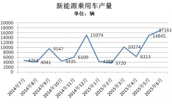 5月、6月的產(chǎn)量再次穩(wěn)固了對新能源乘用車市場的信心。5月生產(chǎn)14845輛,環(huán)比增長135%;6月生產(chǎn)17163輛,環(huán)比增長15.6%。至此,新能源乘用車2015年1-6月累計生產(chǎn)5.67萬輛,已超過去年全年5.45萬輛的產(chǎn)量。