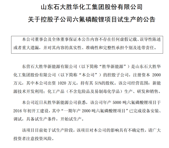 石大勝華:控股子公司年產(chǎn)2000噸六氟磷酸鋰項目試生產(chǎn)