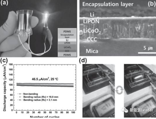 傳統(tǒng)的液體電解質(zhì),由于熱穩(wěn)定、機(jī)械穩(wěn)定差等問題,使得柔性電池的可彎曲性受到了很大的限制,而近年來發(fā)展起來的塑料晶體電解質(zhì)恰好解決了傳統(tǒng)的液體電解質(zhì)穩(wěn)定性差的問題,塑料晶體電解質(zhì)主要由鋰鹽和塑料晶體組成,具有良好的熱穩(wěn)定性和較好的離子電導(dǎo)率,但是傳統(tǒng)的塑料晶體電解液在室溫下更多呈現(xiàn)出液體的行為,因此導(dǎo)致其存在機(jī)械性能差等問題,需要通過相應(yīng)的改造手段進(jìn)行改造,通過在在塑料晶體電解質(zhì)中添加PET纖維,可以顯著的改善塑料晶體電解質(zhì)的機(jī)械性能,以LiCoO2為正極,Li4Ti5O12為負(fù)極,以經(jīng)過強(qiáng)化處理的塑料晶體電解質(zhì)為電解質(zhì)和隔膜,該電池表現(xiàn)出了良好的可彎曲性,即使在纏繞幾圈的前提下,依然能夠正常工作。但上述電解質(zhì)的厚度一般為25um左右,還無法滿足輕薄化鋰離子電池的設(shè)計(jì)需求,于是人們對鋰磷氧LPON材料進(jìn)行研究,該固體電解質(zhì)的厚度可以做到2um,仍然能夠保持良好的電化學(xué)性能。