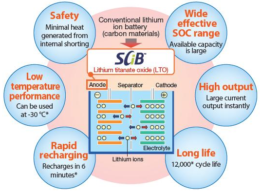 國(guó)內(nèi)生產(chǎn)鈦酸鋰材料比較早的有銀隆、微宏等。其實(shí)早在10年前(2007年),東芝就有了基于鈦酸鋰負(fù)極的鋰離子電池問世,東芝給它取了一個(gè)特別的名字:超級(jí)充電離子電池(Super Charge ion Battery, SCiB),它能在5分鐘之內(nèi)充滿90%的能量!這里主要是通過SCiB電池的性能數(shù)據(jù)來說明鈦酸鋰鋰離子電池的優(yōu)缺點(diǎn),給不了解該類電池的讀者