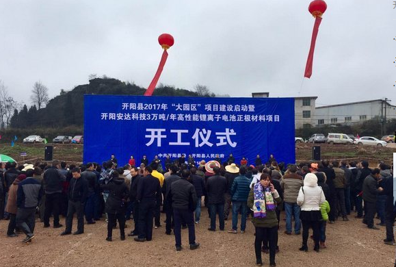 3月15日,貴陽市開陽縣舉行2017年“大園區(qū)”項目建設(shè)啟動暨貴州安達科技能源股份有限公司年產(chǎn)3萬噸鋰離子正極材料項目開工儀式,拉開了開陽縣“大園區(qū)”建設(shè)的序幕。