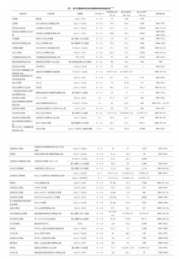 通常來講,非對(duì)稱超級(jí)電容有更高的工作電壓和能量功率密度。從材料的角度來看,基于石墨烯的非對(duì)稱超級(jí)電容的正極材料包括氧化錳、氧化鈷、氧化釕、聚苯胺、聚吡咯,純石墨烯、以及石墨烯與上述材料的復(fù)合物;負(fù)極材料包括石墨烯,多孔石墨烯,石墨纖維,石墨烯薄膜、石墨/碳納米管和石墨烯金屬氧化物復(fù)合物氧化物等。表1總結(jié)了目前基于石墨烯材料的非對(duì)稱超級(jí)電容的研究進(jìn)展,比較了不同石墨烯基非對(duì)稱超級(jí)電容的性能。