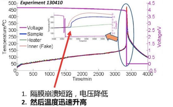 試驗(yàn)數(shù)據(jù)顯示,當(dāng)電池單體溫度達(dá)到135℃時(shí),隔膜開始融化,電壓下降;150℃電池電壓快速下降;等溫度高達(dá)245℃時(shí),隔膜完全崩潰,電池就會出現(xiàn)起火爆炸的現(xiàn)象。