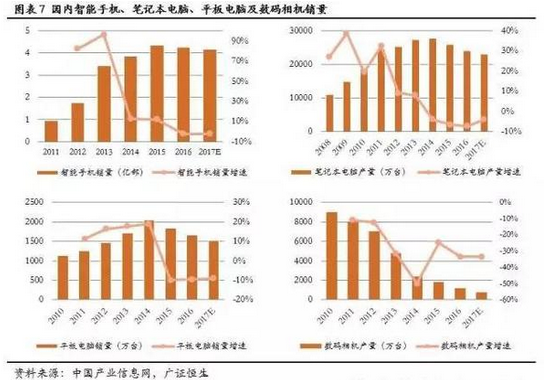 消費(fèi)類電子產(chǎn)品是鋰電池自商用以來(lái)最主要的應(yīng)用領(lǐng)域,主要包括手機(jī)、筆記本電腦、平板電腦、數(shù)碼相機(jī)等傳統(tǒng)3C數(shù)碼類需求,以及網(wǎng)絡(luò)設(shè)備、游戲設(shè)備、導(dǎo)航設(shè)備、可穿戴設(shè)備、電動(dòng)工具等新興需求。2014年前后,由于市場(chǎng)趨于飽和,傳統(tǒng)3C數(shù)碼類電子產(chǎn)品的消費(fèi)量均出現(xiàn)不同程度的下滑;而新興需求端,如導(dǎo)航終端設(shè)備、智能可穿戴設(shè)備的市場(chǎng)規(guī)模則呈現(xiàn)較快擴(kuò)張的態(tài)勢(shì);綜合預(yù)計(jì)消費(fèi)類鋰電池銷量增速將保持在5%以上。
