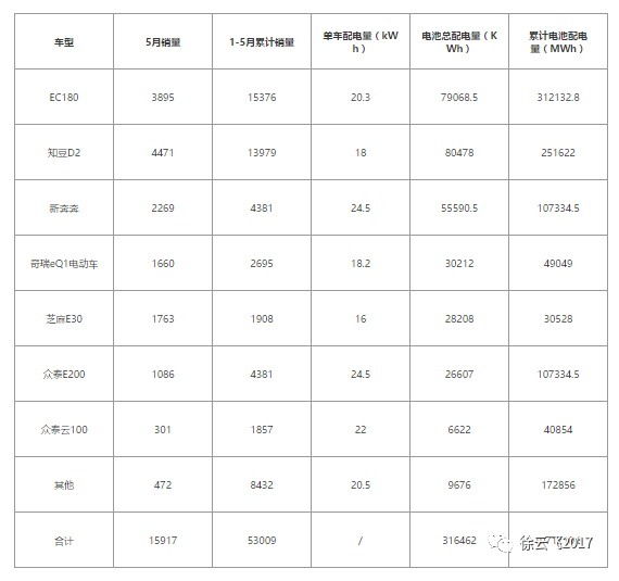 在1-5月總銷量中,北汽EC180和知豆D2也穩(wěn)居一、二(15376、13979),奇瑞eQ系列以5834臺的銷量排在第六。榮威eRX5(7664)、帝豪EV(7405)、和比亞迪e5(7239)憑借7000量級銷量占據(jù)前五位置。