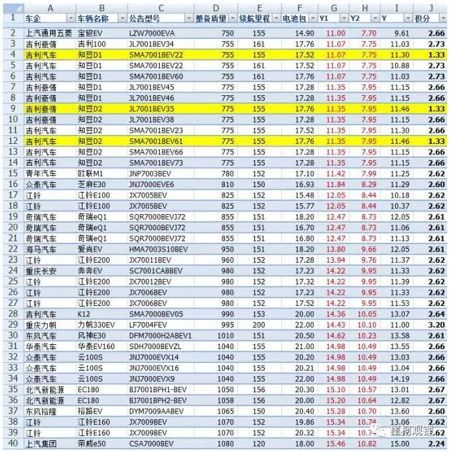 積分系數(shù)為1.2的有12款產(chǎn)品,占比12%,分別是:北汽EU260(BJ7000C5E2G-BEV、BJ7000C5E2 -BEV)、比亞迪e5 300(BYD7005BEV)和秦EV(BYD7008BEV1有兩個子款)、東風(fēng)俊風(fēng)ER30(DFA7000L2ABEV)和啟辰e30(DFL7000B2BEV)、吉利帝豪EC7-EV(MR7002BEV03)、奇瑞艾瑞澤5e(SQR7000BEVJ601)、東風(fēng)悅達起亞華騏E300(YQZ7002BEV)、長城C30EV(CC7000 CE00BEV)、長安逸動EV(SC7003AABEV)。表中以綠顏色顯示。