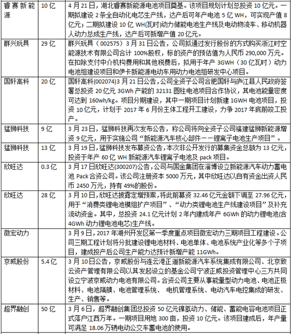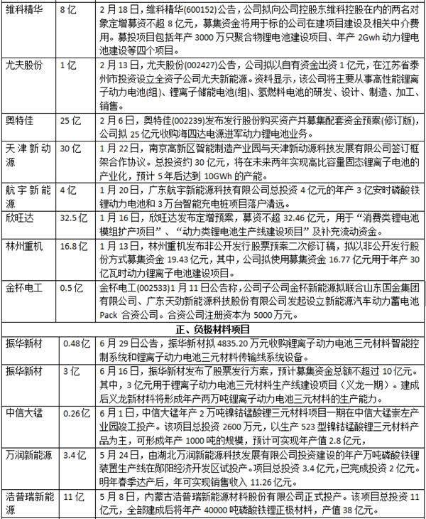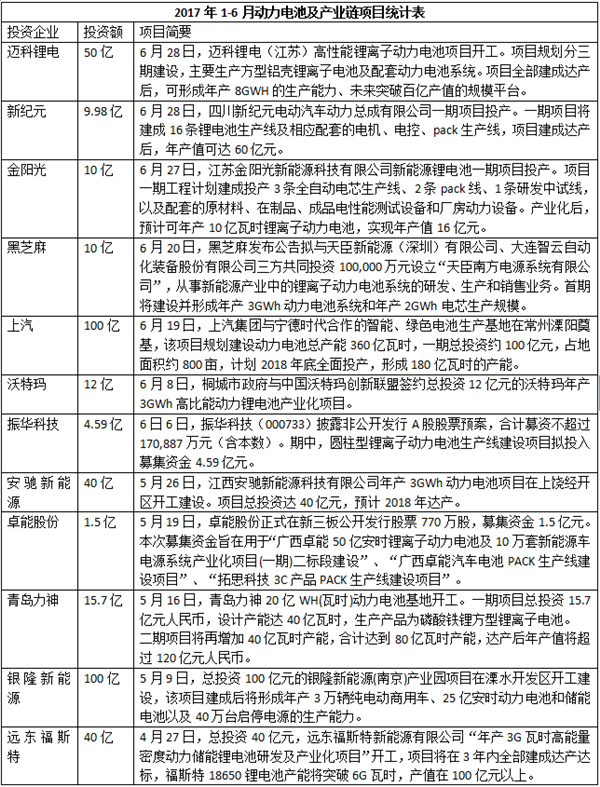 在2017年上市公司公告及公開(kāi)報(bào)道中,不完全統(tǒng)計(jì)2017年上半年動(dòng)力電池領(lǐng)域的投資情況,統(tǒng)計(jì)在內(nèi)的52個(gè)投資項(xiàng)目總投資額達(dá)到919.96億元。其中,動(dòng)力鋰電池項(xiàng)目有30個(gè),投資額達(dá)到676.27億元;正負(fù)極材料項(xiàng)目有16個(gè),投資額達(dá)183.19元;電解液及隔膜項(xiàng)目有6個(gè),投資額為60.5億元。