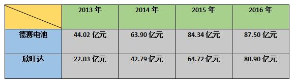 對(duì)比一下兩者近些年來(lái)的營(yíng)收增長(zhǎng),可以清晰的看出,兩者的營(yíng)收一直都處于增長(zhǎng)狀態(tài),只不過(guò)欣旺達(dá)的增長(zhǎng)速度要超過(guò)德賽電池!欣旺達(dá)2016年?duì)I收一舉突破80億元大關(guān),同比增長(zhǎng)25.01%,而德賽電池2016年的營(yíng)收為87.5億元,與2015年的84.34億元相比同比增長(zhǎng)了3.40%。