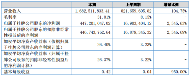 8月29日,金川科技(837205)公布了2017年半年度報告,上半年公司實現(xiàn)營收16.83億元,同比增長104.75%;歸屬于掛牌公司股東的凈利潤為4.47億元,同比增長2545.63%。