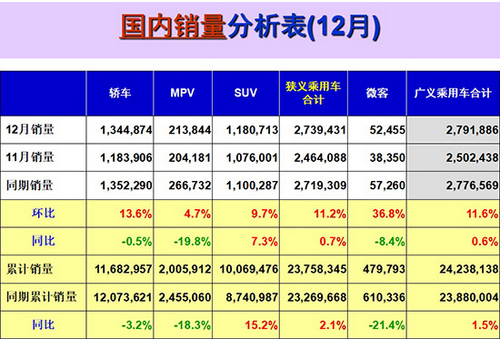 2018年1月9日,全國(guó)乘用車市場(chǎng)信息聯(lián)席會(huì)(以下簡(jiǎn)稱“乘聯(lián)會(huì)”)發(fā)布數(shù)據(jù)顯示:2017年12月我國(guó)狹義乘用車銷量為2739431輛,同比增長(zhǎng)0.7%,環(huán)比漲幅為11.2%。由此,我國(guó)狹義乘用車市場(chǎng)全年數(shù)據(jù)也正式出爐,2017年全年,我國(guó)狹義乘用車?yán)塾?jì)銷量達(dá)到23758345輛,同比增速為2.1%。