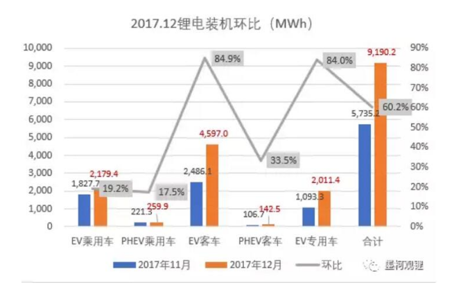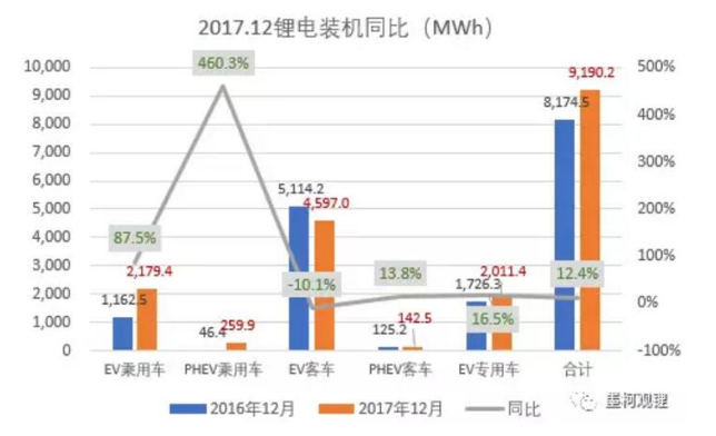 由于補(bǔ)貼政策的退坡,2015年和2016年的11月和12月都引發(fā)了電動(dòng)汽車(chē)的搶裝潮,這兩個(gè)月的鋰電裝機(jī)量相當(dāng)于全年的一半。2017年的11月,由于擔(dān)心補(bǔ)貼政策提前退坡,同樣出現(xiàn)了一定程度的搶裝,12月?lián)屟b程度更甚,而且集中在純電動(dòng)客車(chē)和純電動(dòng)專(zhuān)用車(chē)方面。這主要是傳聞中的補(bǔ)貼退坡政策所導(dǎo)致。12月鋰電裝機(jī)高達(dá)9.19GWh,創(chuàng)造了月度新高,同比增長(zhǎng)12.4%。具體情況見(jiàn)下圖: