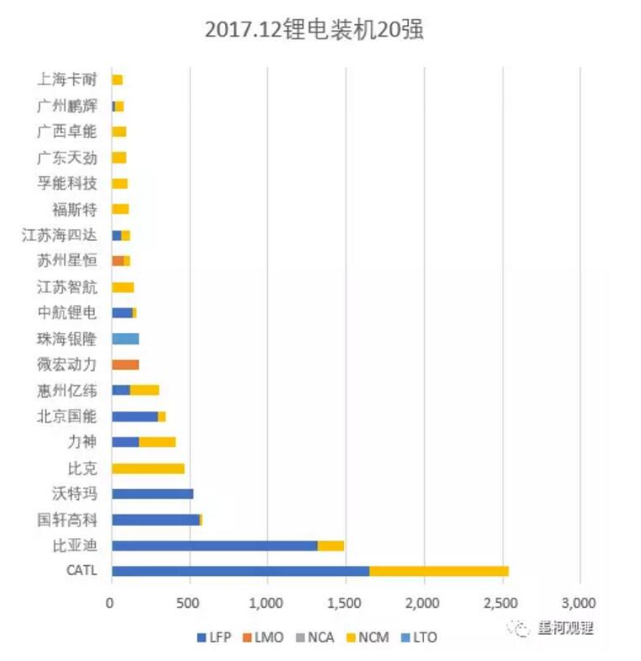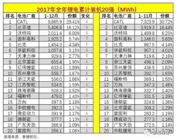 2017年全年鋰電累計(jì)裝機(jī)20強(qiáng)見(jiàn)上表??傮w來(lái)看,捷威動(dòng)力的裝機(jī)量滑到了20名之外,替代它的是微宏動(dòng)力,其他19家電池廠(chǎng)商繼續(xù)在榜單中,不同的只是排名的細(xì)微變化。具體來(lái)看,前10強(qiáng)中,排在前三位的CATL、比亞迪和沃特瑪?shù)氖袌?chǎng)份額都有所下滑,排在第4、5、7位的國(guó)軒高科、比克、天津力神的市場(chǎng)份額則有所上升。這7家電池廠(chǎng)商的排名沒(méi)有變化。由于12月裝機(jī)量的大幅增長(zhǎng),北京國(guó)能和億緯鋰能擠進(jìn)了前10位。