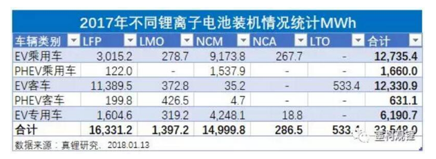 從各類(lèi)型鋰離子電池來(lái)看,2017年磷酸鐵鋰電池實(shí)現(xiàn)裝機(jī)16.33GWh,占比48.68%,依然保持著第一的為主,但是比重較上一年度有了大幅度下降,絕對(duì)量與上一年度相比也是明顯下降。NCM三元電池實(shí)現(xiàn)裝機(jī)15GWh,占比44.71%,絕對(duì)量同比增長(zhǎng)翻了一番有余,比重也有了大幅度提高。錳酸鋰電池實(shí)現(xiàn)裝機(jī)1.4GWh,占比4.16%;NCA三元電池實(shí)現(xiàn)裝機(jī)286.5MWh,成績(jī)基本上都是在下半年取得的;鈦酸鋰電池實(shí)現(xiàn)裝機(jī)533.4MWh,絕大多數(shù)是由珠海銀隆供應(yīng)。