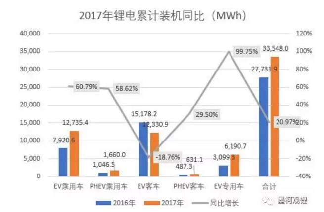 2、2017全年鋰電累計(jì)裝機(jī)33.55GWh,同比增長(zhǎng)21%