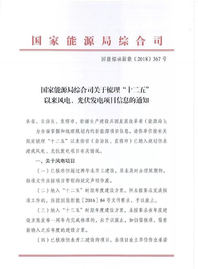 2018年9月19日,國家能源局綜合司發(fā)布關(guān)于梳理“十二五”以來風(fēng)電、光伏發(fā)電項目信息的通知,通知要求對不滿足要求的風(fēng)電項目應(yīng)及時予以廢止,已核準(zhǔn)未開工項目業(yè)主需承諾開工建設(shè)的時間節(jié)點(diǎn);光伏、風(fēng)電項目需明確是否需要申請國家可再生能源發(fā)電補(bǔ)貼。原文如下: