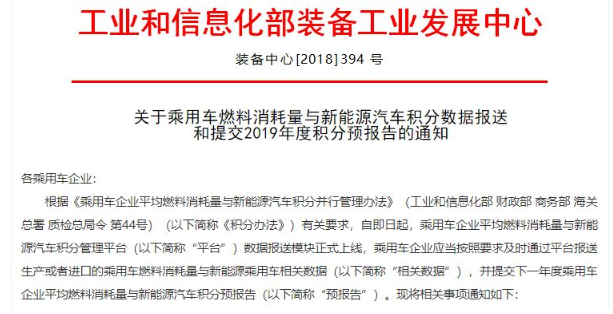 12月4日,工業(yè)和信息化部裝備工業(yè)發(fā)展中心發(fā)布通知,要求乘用車企業(yè)按要求報送生產(chǎn)或進(jìn)口的乘用車燃料消耗量與新能源乘用車相關(guān)數(shù)據(jù)。2018年12月20日前,各乘用車企業(yè)還應(yīng)向工業(yè)和信息化部提交2019年度積分預(yù)報告。