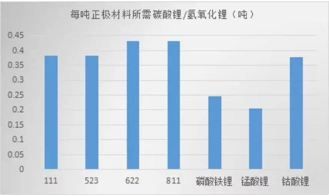 細(xì)化來(lái)看,不同正極材料對(duì)碳酸鋰的使用量不同,三元明顯高于磷酸鐵鋰和錳酸鋰材料。