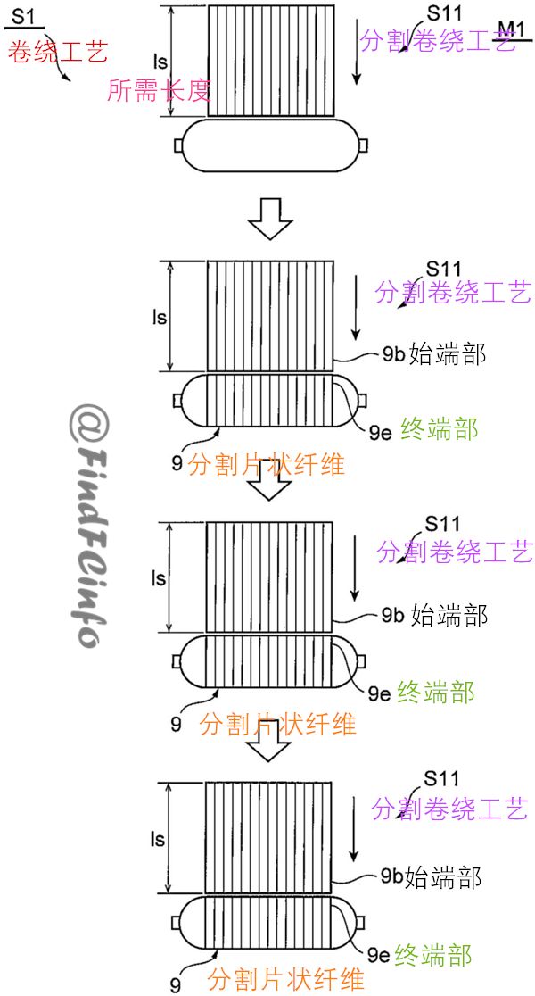 具體如上圖所示,在罐的制造方法M1中,卷繞工序S1具有對通過將片狀纖維FS分割成比為了形成指定的厚度的片層所需要長度Ls短的長度ls而成的卷繞分割片狀纖維進行卷繞的多次分割卷繞工序S11。在各次的分割卷繞工序S11中,與通過一個較長片狀纖維FS連續(xù)卷繞時作用于其的不均勻張力相比,能夠以更均勻的張力來卷繞分割片狀纖維。因此,制造方法M1不受分割片狀纖維厚度微小差別等的影響,能夠防止在構(gòu)成片層的分割片狀纖維產(chǎn)生集中、局部的縫隙而均勻地層疊分割片狀纖維。