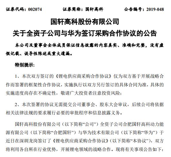 6月5日,國軒高科發(fā)布公告稱,全資子公司合肥國軒與華為于近日簽訂了《鋰電供應(yīng)商采購合作協(xié)議》,雙方將利用各自所在行業(yè)優(yōu)勢,開展鋰電領(lǐng)域的戰(zhàn)略合作。