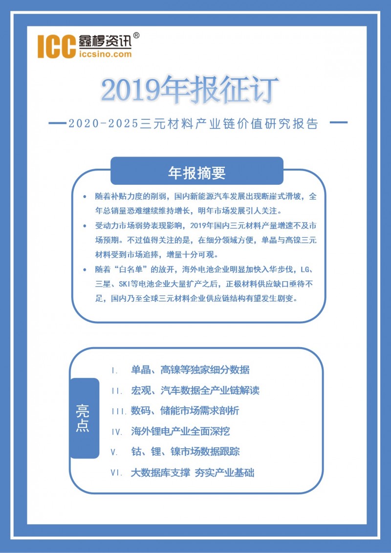 2019年報征訂,三元材料產(chǎn)業(yè)鏈細分研究,詳情如下。