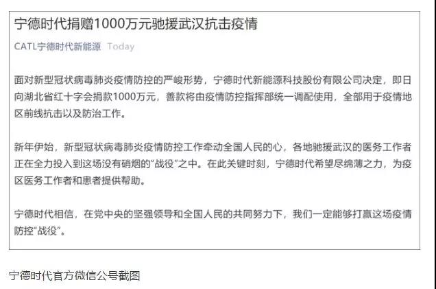 1月27日,據寧德時代官方微信公號,為面對新型冠狀病毒肺炎疫情防控的嚴峻形勢,寧德時代新能源科技股份有限公司決定,即日向湖北省紅十字會捐款1000萬元。