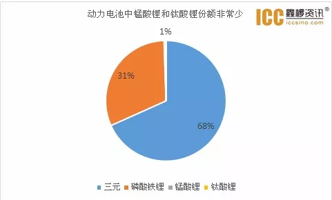 分材料體系來看,磷酸鐵鋰電池0.72GWH,占比31.2%;三元電池1.58GWH,占比68.3%,合計市場份額99.5%,錳酸鋰和鈦酸鋰市場份額較少。