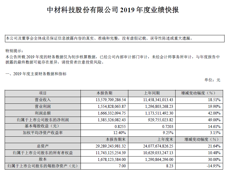 2月29日,中材科技(002080)發(fā)布業(yè)績(jī)快報(bào),公司2019年實(shí)現(xiàn)營(yíng)業(yè)收入135.8億元,同比增長(zhǎng)18.51%;歸屬于上市公司股東的凈利潤(rùn)13.85億元,同比增長(zhǎng)49%。