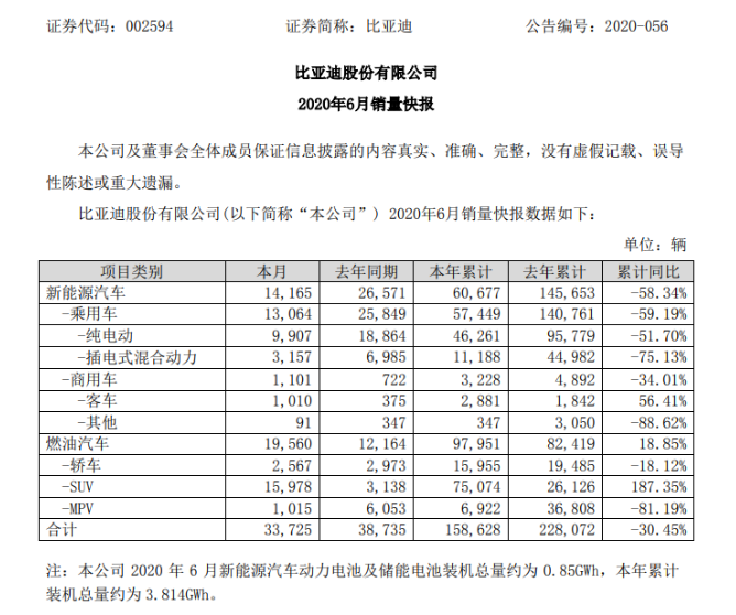 公告還披露,公司2020年6月新能源汽車(chē)動(dòng)力電池及儲(chǔ)能電池裝機(jī)總量約為0.85GWh,本年累計(jì)裝機(jī)總量約為3.814GWh。