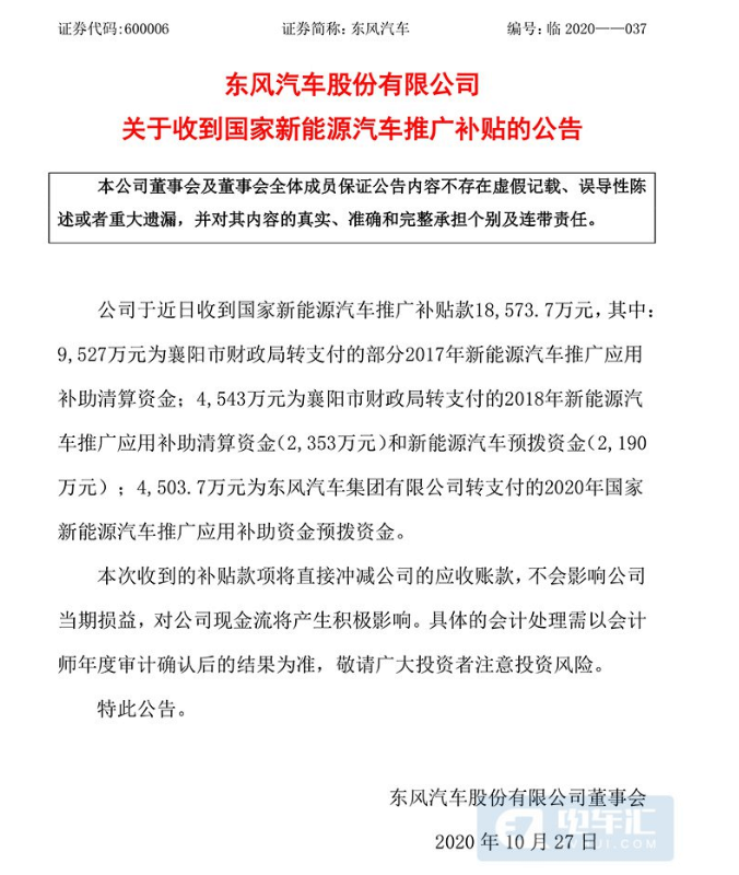 10月26日,東風汽車發(fā)布公告稱,公司于近日收到國家新能源汽車推廣補貼款1.86億元,將直接沖減公司的應(yīng)收賬款,不會影響公司當期損益。
