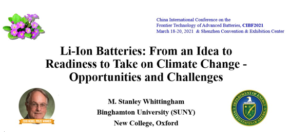 自第一輪通知頒布以來,鑒于國內(nèi)疫情態(tài)勢逐漸好轉(zhuǎn),許多大型活動逐步開放,使我們信心倍增。但是國際上的疫情卻更加趨于嚴(yán)重,這使我們又一次想到CIBF2021的國際盛會能否如期舉辦?能否有足夠多的國際學(xué)者和公司人員參加?因此,邀請國際演講人和如何安排他們的演講就成為我們籌備工作中的第一件大事。經(jīng)過反復(fù)介紹與邀請,這次“國際先進(jìn)電池前沿技術(shù)研討會”繼續(xù)受到國內(nèi)外的高度關(guān)注。截至到2021年1月6日,我們已經(jīng)收到國內(nèi)外特邀演講和申請演講項目近70個,遠(yuǎn)遠(yuǎn)超過了我們的預(yù)期和三天會期可安排的數(shù)量(按一個會場計)。更可喜的是我們本次會議已落實的來自包含了美國、法國、奧地利、日本、韓國、加拿大、英國、德國、以色列、巴西、西班牙等10余個國家的國外演講文章。其中特別是邀請到2019年諾貝爾化學(xué)獎得主之一的M. Stanley Whittingham教授的主題演講(鋰離子電池:從理念轉(zhuǎn)至應(yīng)對氣候變化的機(jī)遇),如其PPT首頁所示。