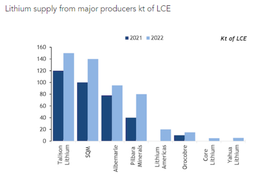 一些市場參與者表示,今年全球碳酸鋰供應量將從2021年的43萬噸增加22萬噸,相當于66萬噸,增長的主要原因是智利的SQM、智利Albemare的La Negra III 和 IV、澳大利亞泰利森鋰業(yè)(Talison Lithium)的Greenbushes 和Pilbara Minerals的Pilgan工廠以及阿根廷的Orocobre Olaroz工廠擴建。