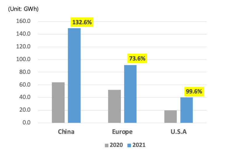 2021年,可以評(píng)價(jià)為中國(guó)市場(chǎng)年,在各大區(qū)域中,中國(guó)市場(chǎng)增長(zhǎng)速度壓倒性最高。由于擴(kuò)大了國(guó)內(nèi)市場(chǎng),以CATL和比亞迪為首的中國(guó)電池制造商脫穎而出。中國(guó)的主導(dǎo)地位是否會(huì)在2022年繼續(xù),還有待觀察。
