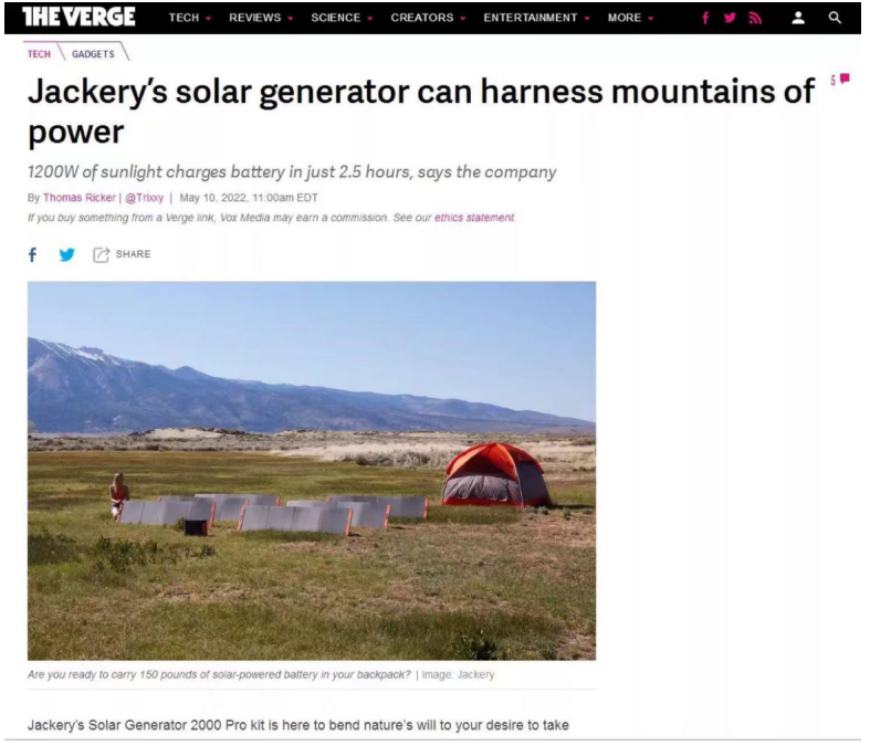 作為全球暢銷的光充戶外電源品牌,電小二Jackery的一舉一動(dòng)都引起市場(chǎng)關(guān)注。此次光充戶外電源2000 Pro也引起了全球媒體的注意,BBC最新夏日旅行專題文章就建議大家van life時(shí)可帶上便攜冰箱、野營(yíng)爐灶、筆記本電腦等設(shè)備提升戶外生活品質(zhì),多接口易操作的Jackery光充戶外電源可在戶外為它們提供電力支持??萍济襟wThe Verge則盛贊Jackery solar Generator可制造澎湃電力。