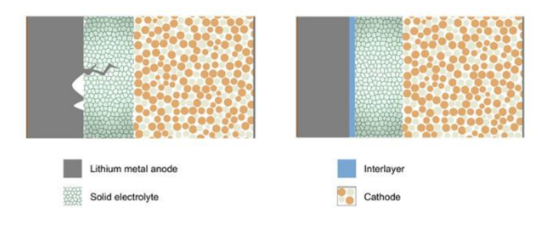 上圖(a)表示具有不連續(xù)界面的鋰金屬固態(tài)電池。這些空隙與不連續(xù)是通過固態(tài)電解質(zhì)生長枝晶的主要驅(qū)動因素,這會使器件短路。可通過某些金屬組成適當(dāng)?shù)膴A層來最小化這些空隙。