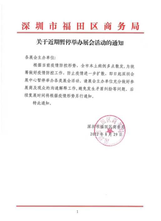 中國化學(xué)與物理電源行業(yè)協(xié)會原計劃于2022年9月25-29日在深圳會展中心舉辦“第六屆深圳國際新型儲能技術(shù)及工程應(yīng)用展覽會CESE2022”。但最近幾天,深圳市多個區(qū)發(fā)生疫情,8月29日深圳市福田區(qū)商務(wù)局向各展會主辦單位發(fā)出“關(guān)于近期暫停舉辦展會活動的通知”:即日起深圳會展中心暫停舉辦展會活動。8月29日深圳市福田區(qū)新型冠狀病毒肺炎疫情防控指揮部發(fā)布“深圳市福田區(qū)新型冠狀病毒肺炎疫情防控指揮部通告(第281號)”,要求:大型會議、活動、論壇、演出、展銷促銷等暫停舉辦。