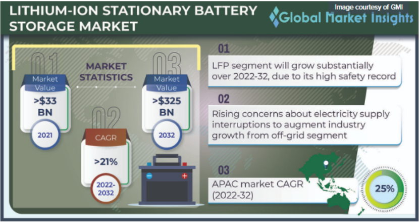 Global Market Insights分析師預(yù)計(jì)2032年,受成本大幅下降的推動(dòng),鋰離子電池固定存儲(chǔ)市場將達(dá)到3,270億美元。