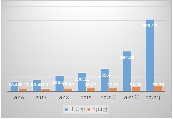 根據(jù)海關(guān)出口數(shù)據(jù)統(tǒng)計(jì)分析,近6年來,鋰離子電池產(chǎn)品一直是中國電池出口的主要品種,出口額占比均超過50%,并呈逐年快速遞增。從2016年的出口額68.41億美元,占比56.67%,快速上升2022年的出口額509.19億美元,占比88.1%;出口數(shù)量從2016年的15.17億只增長到2022年的37.73億只。