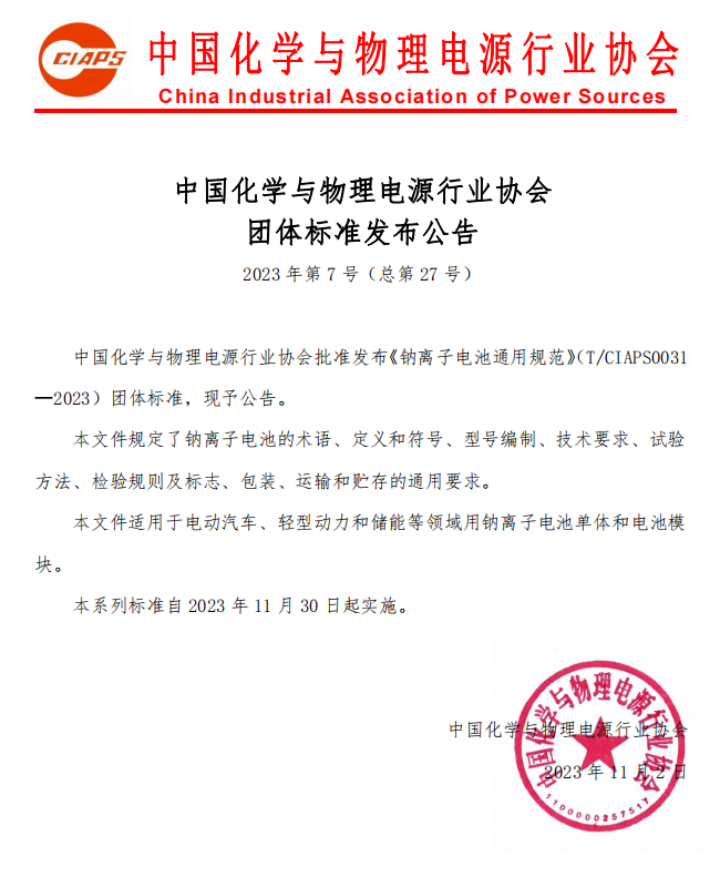 中國化學(xué)與物理電源行業(yè)協(xié)會批準(zhǔn)發(fā)布《鈉離子電池通用規(guī)范》(T/CIAPS0031—2023)團(tuán)體標(biāo)準(zhǔn),現(xiàn)予公告。
