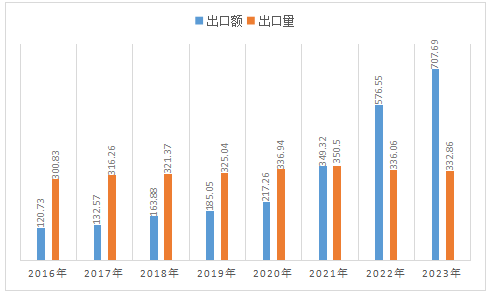 根據(jù)海關(guān)出口數(shù)據(jù)統(tǒng)計(jì)分析,近8年來(lái),鋰離子電池產(chǎn)品一直是中國(guó)電池產(chǎn)品出口的主要品種,出口額占比均超過(guò)50%,并呈逐年快速遞增。從2016年的出口額68.4億美元,占比56.7%,快速上升2023年的出口額707.7億美元,占比91.9%。