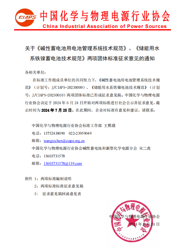 在標(biāo)準(zhǔn)工作組成員單位的共同努力下,《堿性蓄電池用電池管理系統(tǒng)技術(shù)規(guī)范》(計(jì)劃號(hào):J/CIAPS-20230009)、《儲(chǔ)能用水系鐵鎳電池技術(shù)規(guī)范》(計(jì)劃號(hào):J/CIAPS-20230010)兩項(xiàng)團(tuán)體標(biāo)準(zhǔn)已形成征求意見稿。中國(guó)化學(xué)與物理電源行業(yè)協(xié)會(huì)決定于2024年6月24日開始對(duì)兩項(xiàng)標(biāo)準(zhǔn)進(jìn)行社會(huì)公示并征求意見,截止時(shí)間為2024年7月25日。在此期間,企業(yè)對(duì)標(biāo)準(zhǔn)有意見和建議,請(qǐng)聯(lián)系: