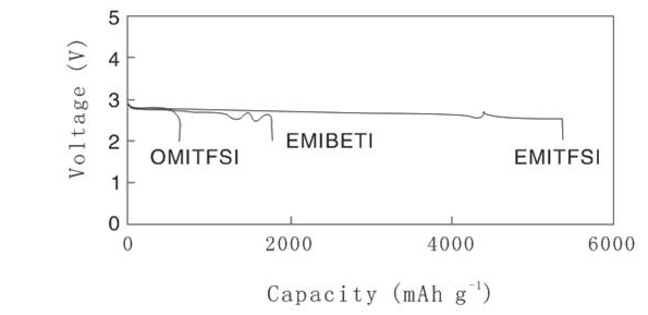 圖3 空氣氣氛下離子液體作為鋰空氣電池電解液時充放電曲線