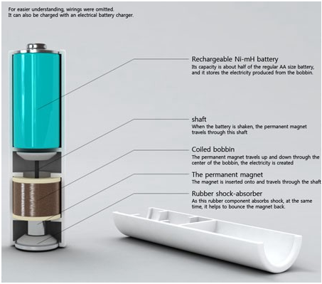 這款ShakEnergy電池與以往電池不同之處在于它是通過手搖就能充電,電池包括5個部分:鎳氫充電電池,軸,永磁體,減震器和外殼。