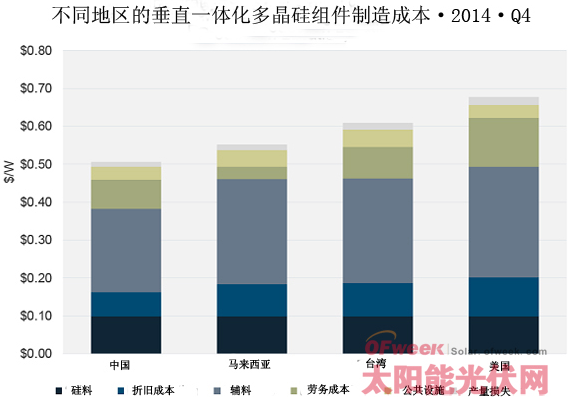 美國的多晶硅組件每瓦平均生產(chǎn)成本為0.68美元。不過,如果考慮到SolarWorld和SolarCity最近宣布的關(guān)于低成本制造的計劃,美國地區(qū)可能會出現(xiàn)一些有趣的變數(shù),值得關(guān)注。