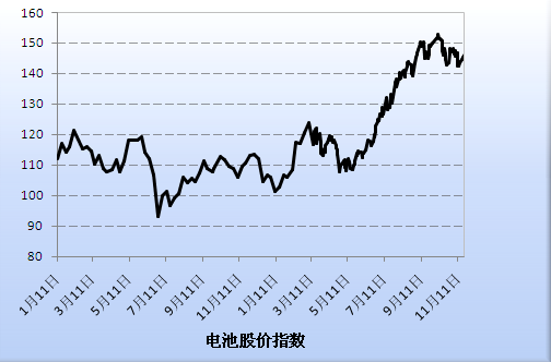 ●指數(shù)以2011年年終收盤(pán)日為基日,設(shè)為100點(diǎn)。指數(shù)的漲跌基本可以反映電池行業(yè)的整體趨勢(shì),供大家參考。