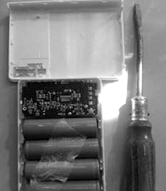 可是通了電也沒見充電寶有任何反應(yīng),連指示燈也沒亮。有點(diǎn)不甘心,他找了螺絲刀拆開外殼,只見里面是一塊簡易線路板,還有四節(jié)紫色電池,由一段膠帶胡亂粘在一起。